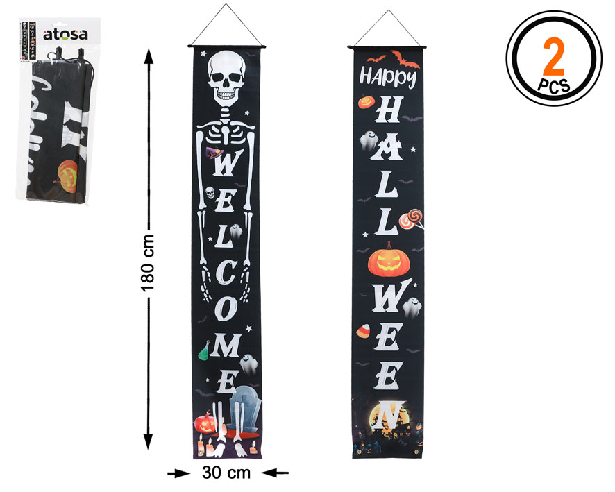 D’une hauteur impressionnante de 180 cm, ces décorations sont parfaites pour encadrer votre porte d’entrée ou décorer un grand mur ! L’une arbore un squelette « WELCOME » tandis que l’autre souhaite un « HAPPY HALLOWEEN » avec des motifs festifs.