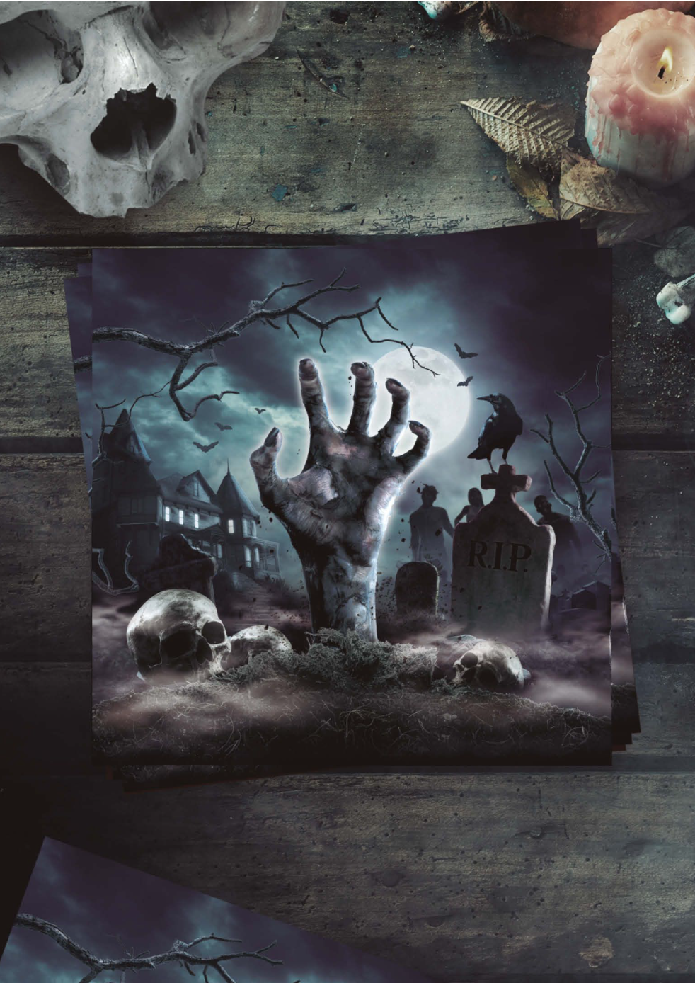 Les Serviettes Thématiques pour une Ambiance de Retour des Morts ! Ces 20 Serviettes « Cimetière » sont parfaites pour compléter votre décoration de table d’Halloween et s’harmoniser avec le thème Horreur/Zombie.