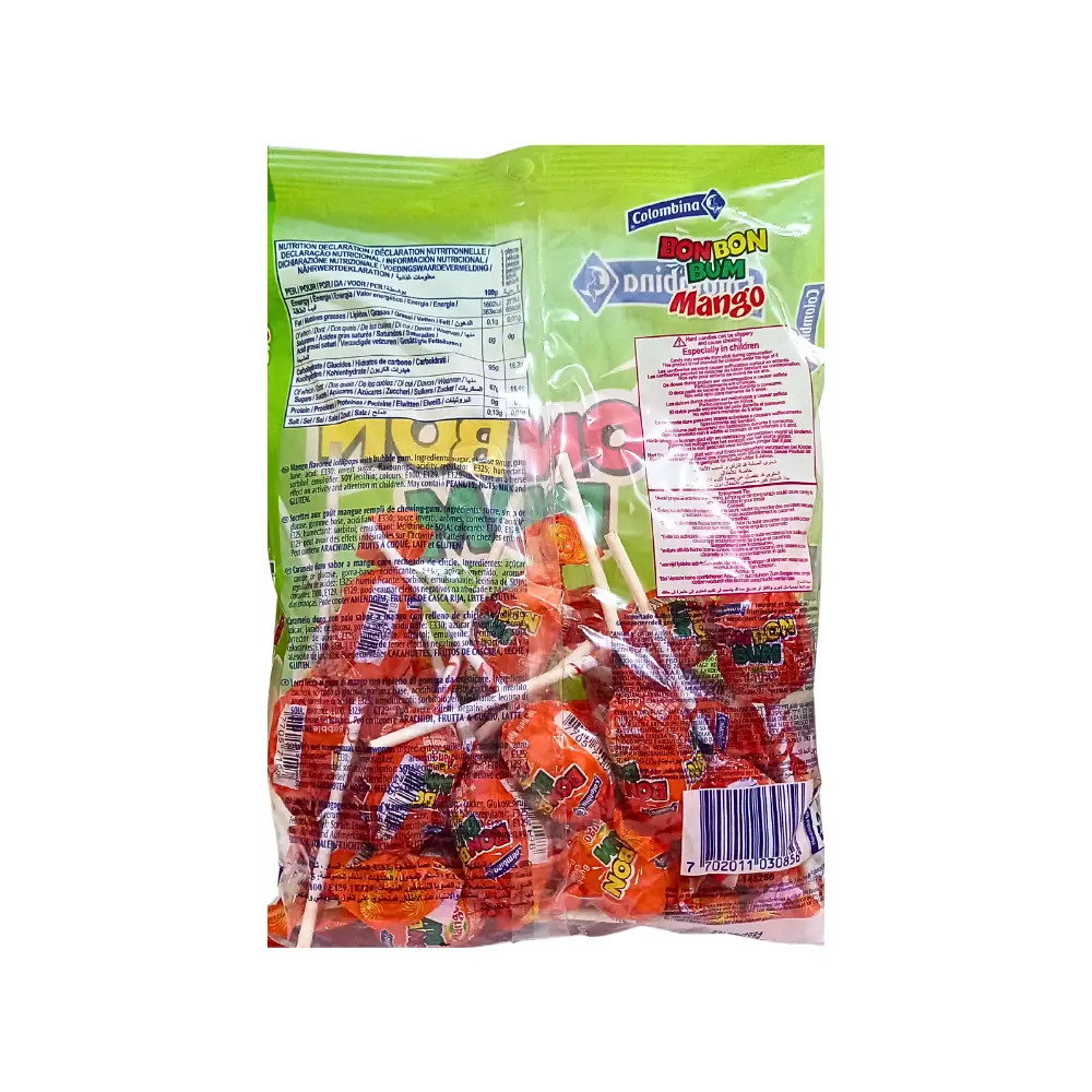 Chaque sachet contient 24 sucettes Bon Bon Bum mangue Colombina garantissant des saveurs fruitées qui saura ravir les petits et des grands.