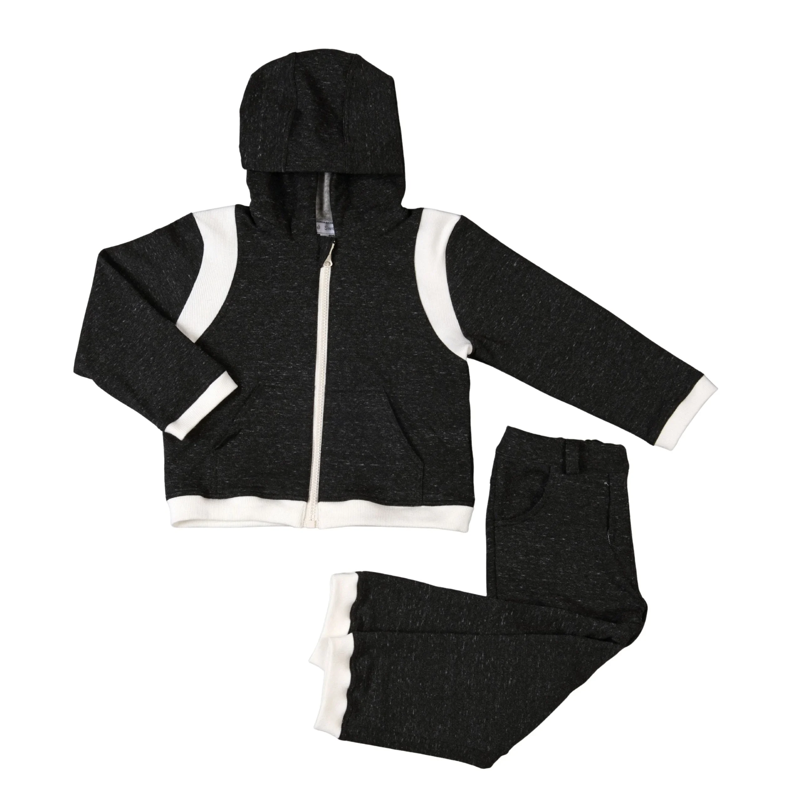 Black two-piece tracksuit for boys, made in cotton jersey (super soft fleecy inside for cosy and warm wear). Fastening with a white zip, the hoodie has a white ribbed cotton details on the shoulders, a large hood with ribbed cuffs to keep in warmth and useful front pockets. The joggers have a stretchy waistband that is soft on little tummies and elasticated leg cuffs to keep the cold out.