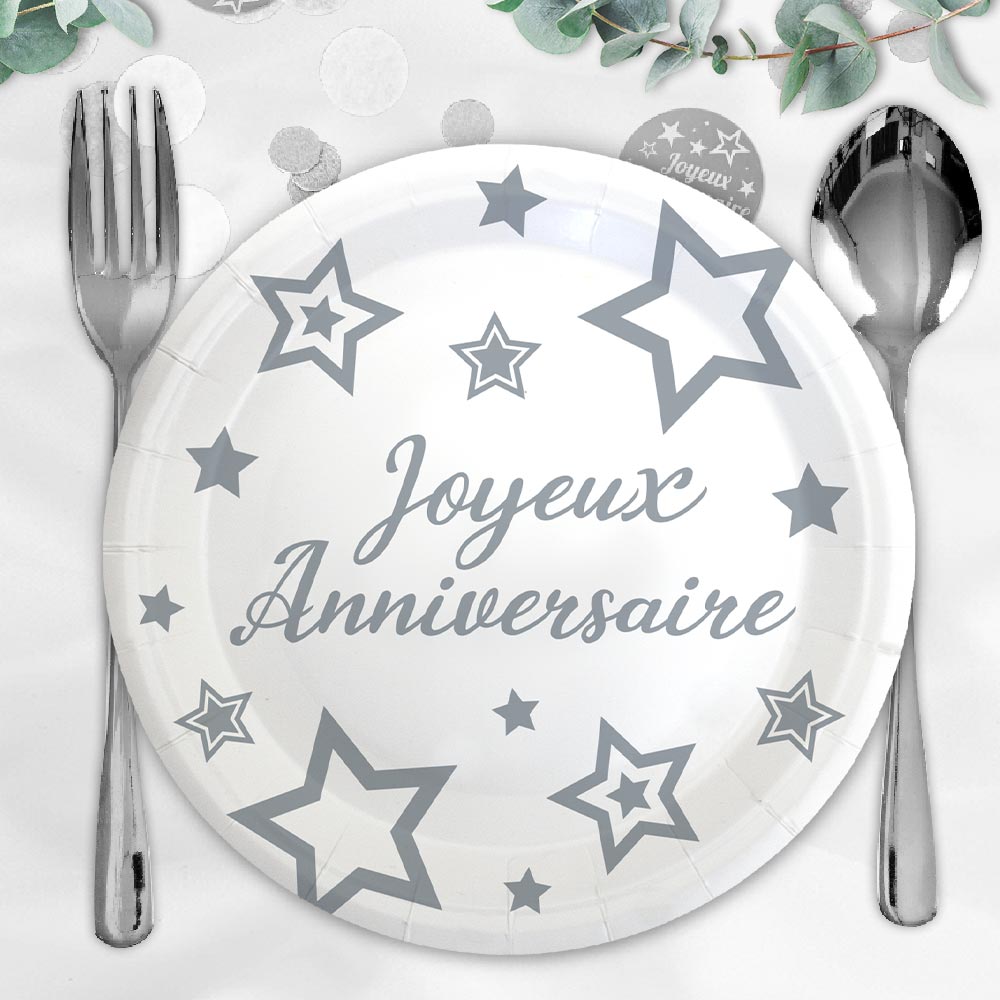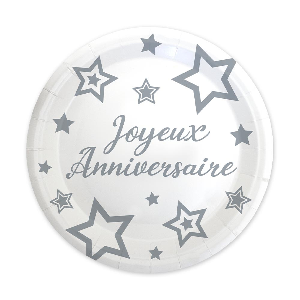 - Mention : « Joyeux Anniversaire » en lettres argentées, entourée d’étoiles argentées pour un effet festif et raffiné.