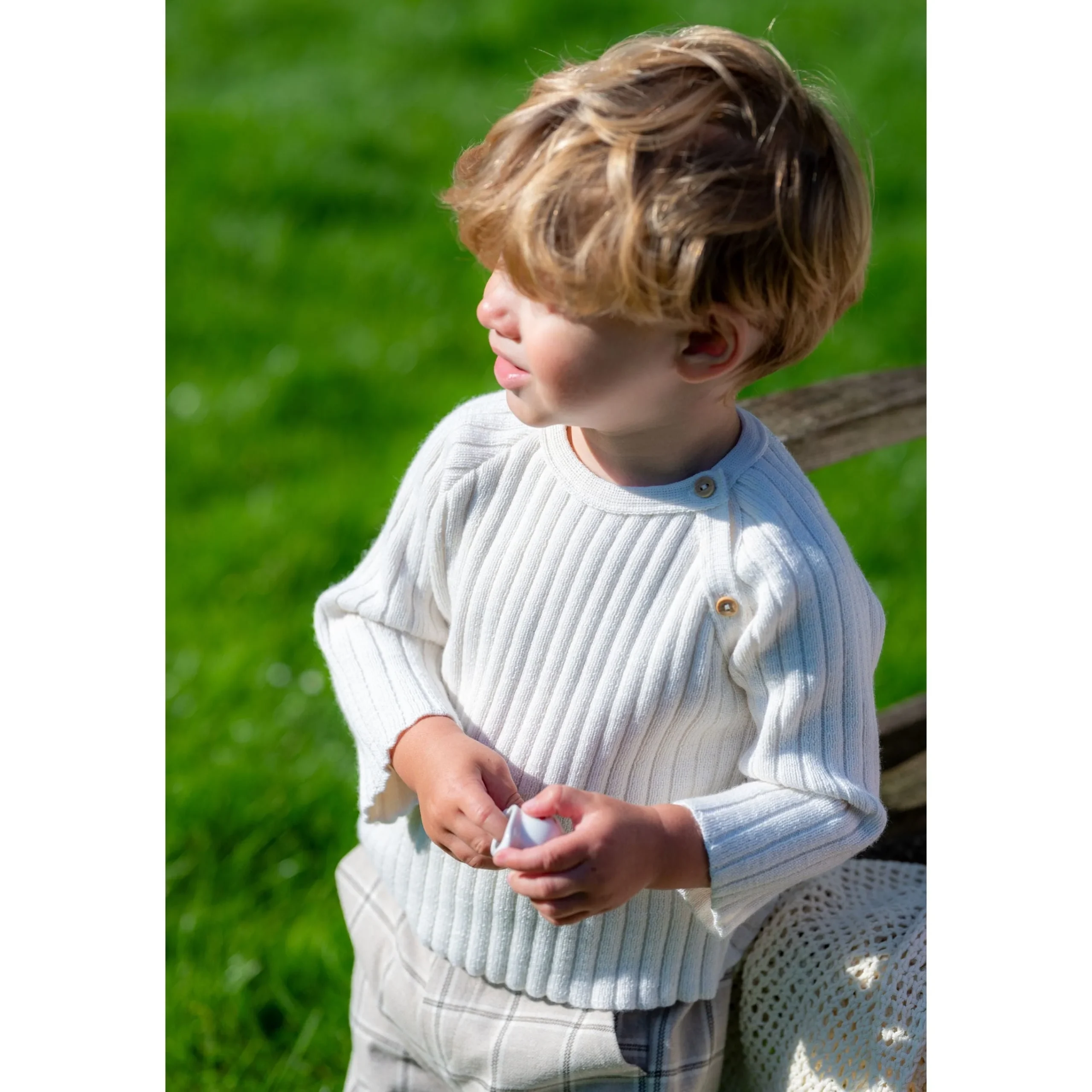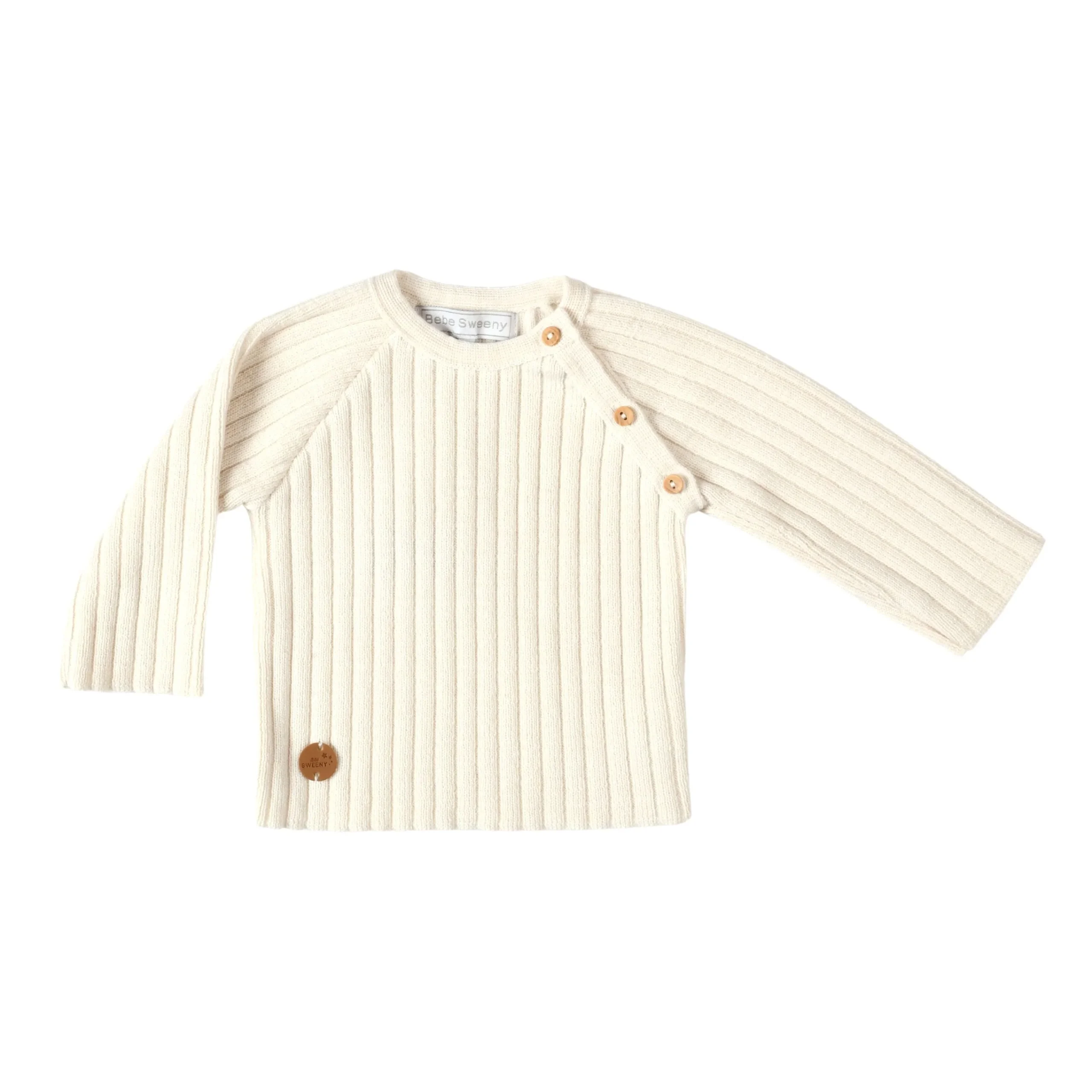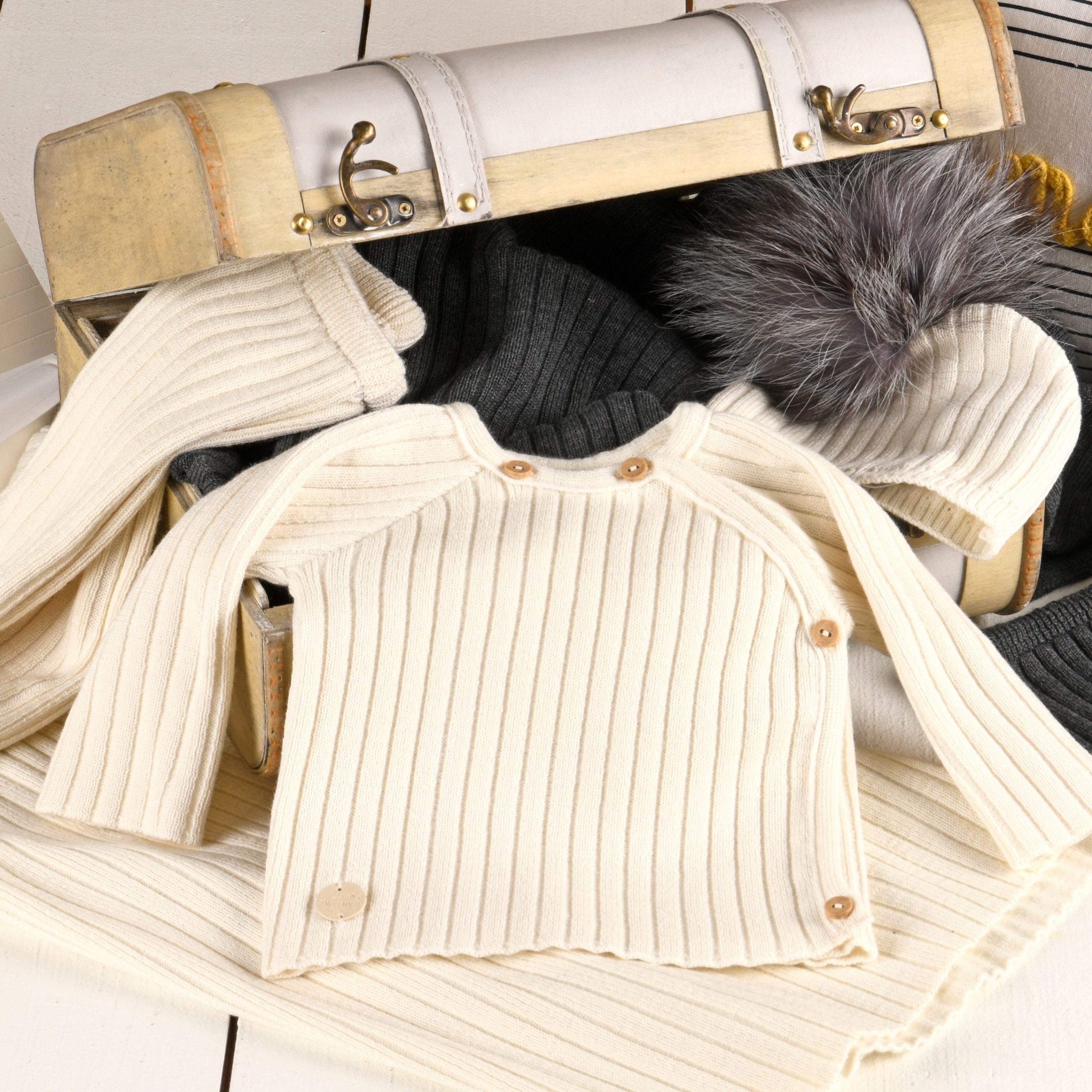 Cream sweater for boys and girls. Super comfortable to wear, it is knitted in an extra soft wool blend. Easily fastening with natural beige wooden buttons on the side. Matching hat, booties and blanket are available in the same collection.