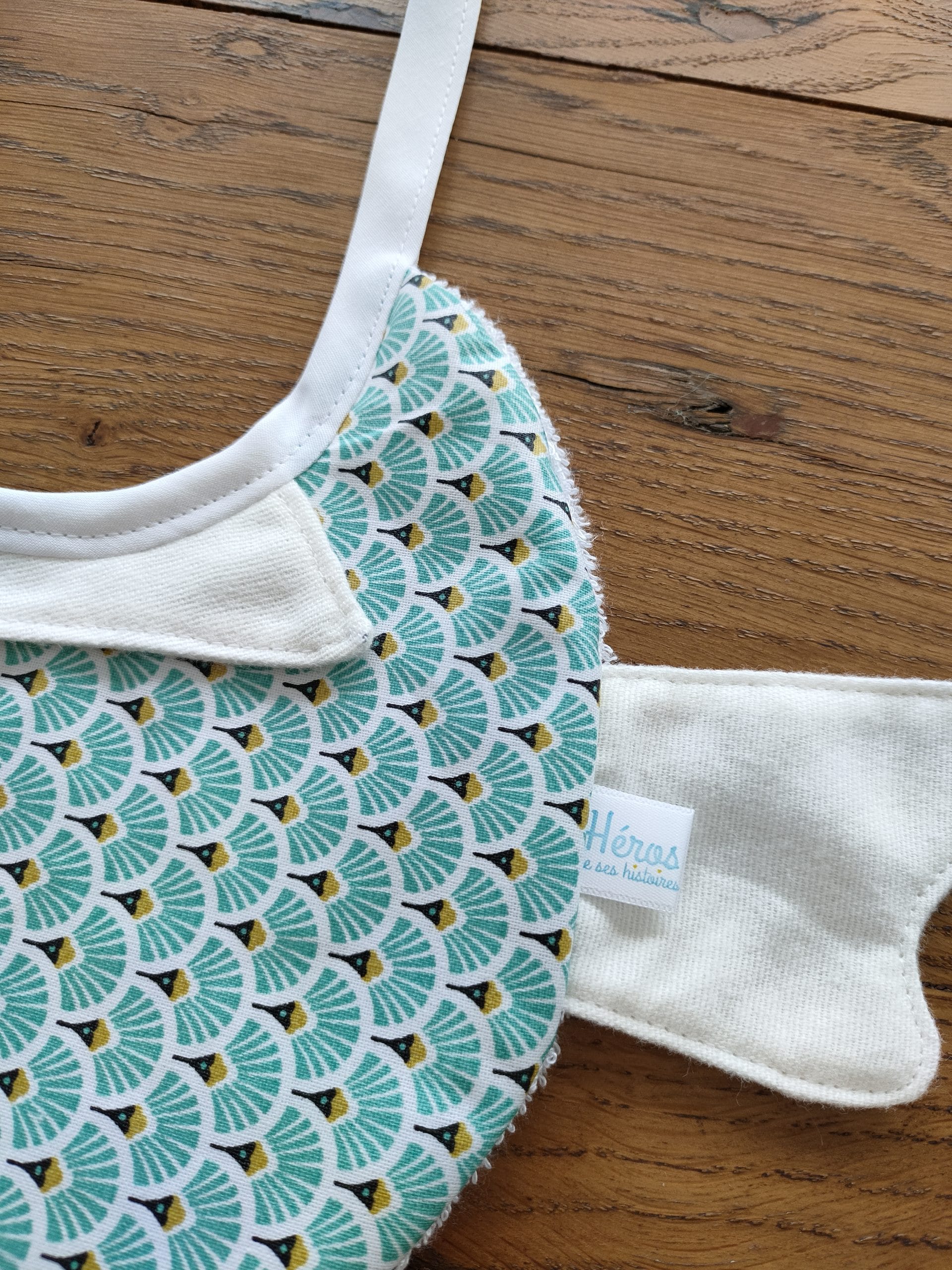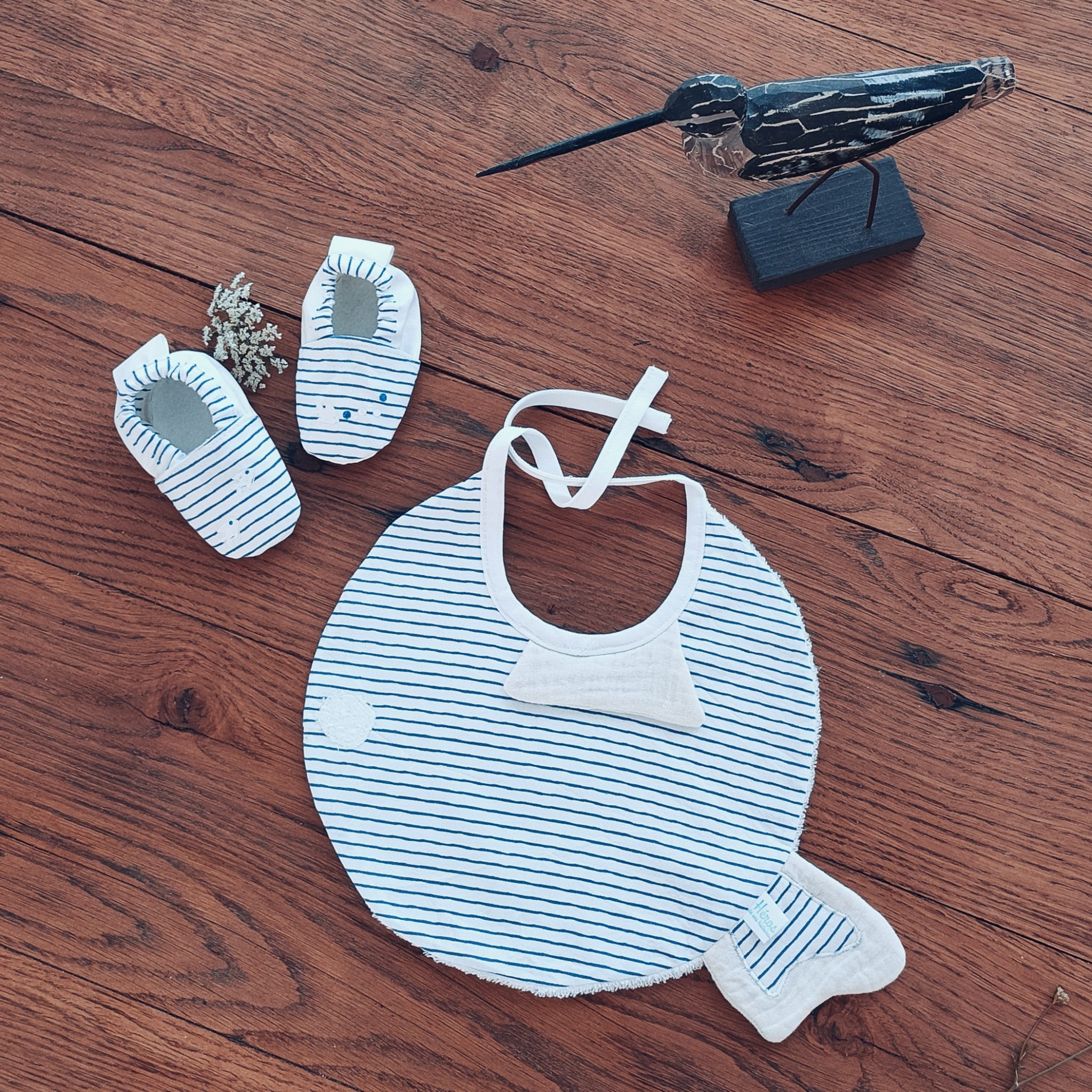Bavoir Poisson pour Bébé en cadeau de naissance De jolis bavoirs en coton ou coton enduit qui peuvent être assortis avec les chaussons pour un cadeau unique ! La gamme des jolis bavoirs accueille ce modèle en forme de petit poisson : 1 modèle en coton et éponge bio : tissu blanc rayé bleu pour le poisson et les chaussons 1 modèle en coton enduit (imperméable) et éponge bio : tissu « éventails japonais » ou tissu bleu marine coeurs rouge pour le poisson et les chaussons Retrouvez les chaussons de naissance pour bébé assortis à nos bavoirs ! Fermeture du bavoir…