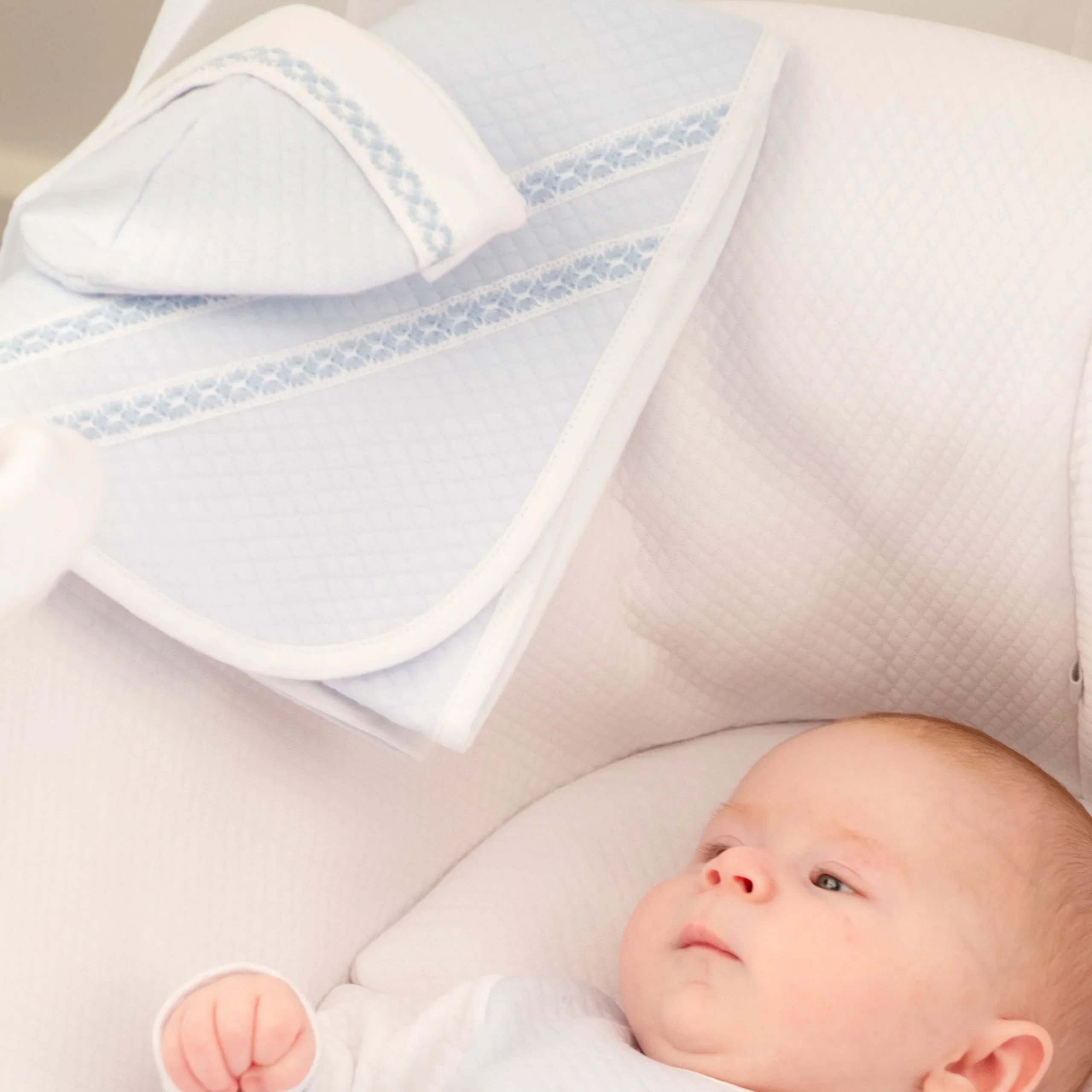 Made with soft blue quilted cotton, this hat is perfect to finish the baby boy outfit available in the same collection. The white and blue lace accent adds a subtile special detail and it is lined in super soft white cotton for extra comfort.