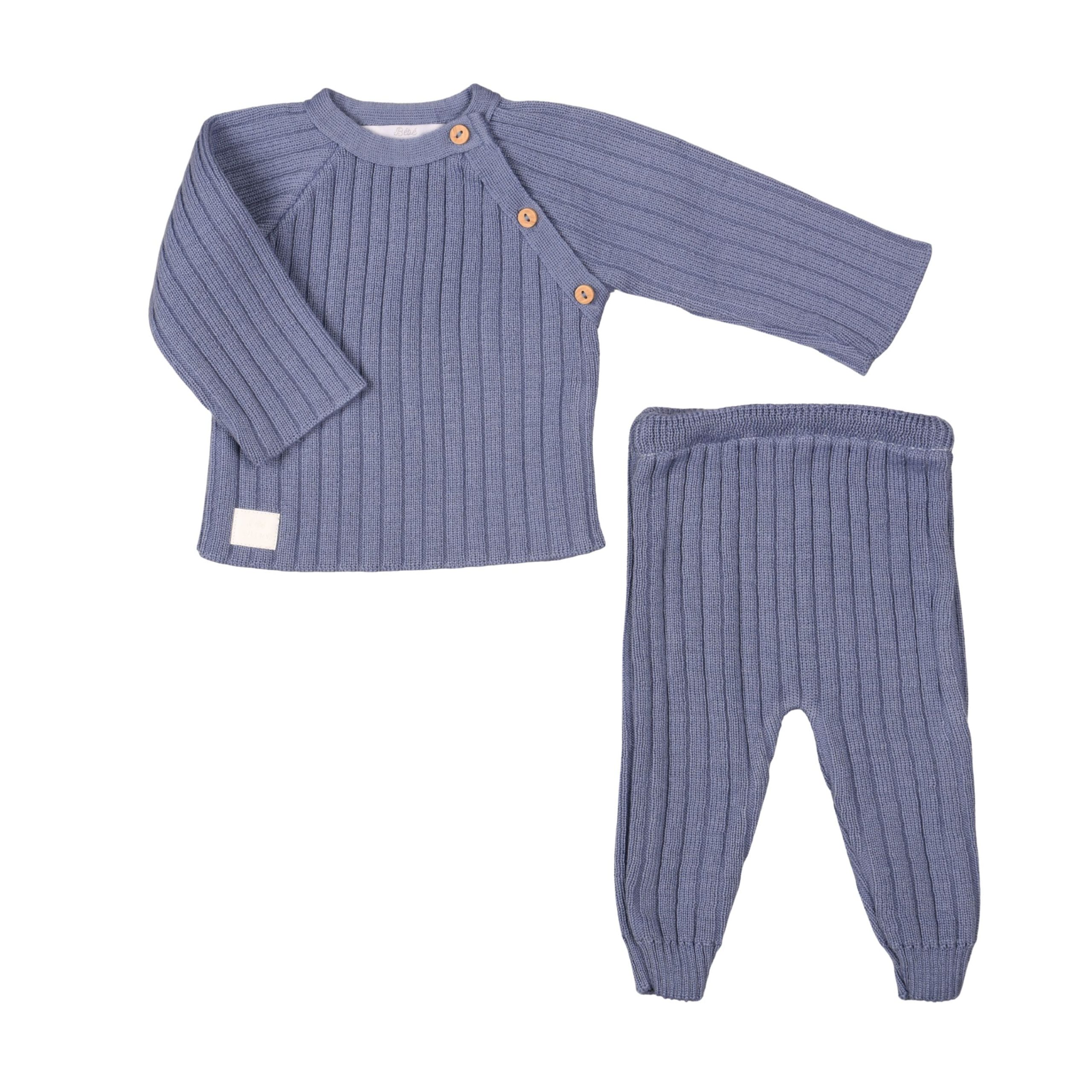 Baby boys gorgeous dusty blue trousers set in ribbed knit. Super soft and comfortable, the sweater fastens on the side with natural beige wooden buttons. The matching trousers are full length and have an elasticated waistband. Complete the set with the matching hat and blanket available in the same collection.