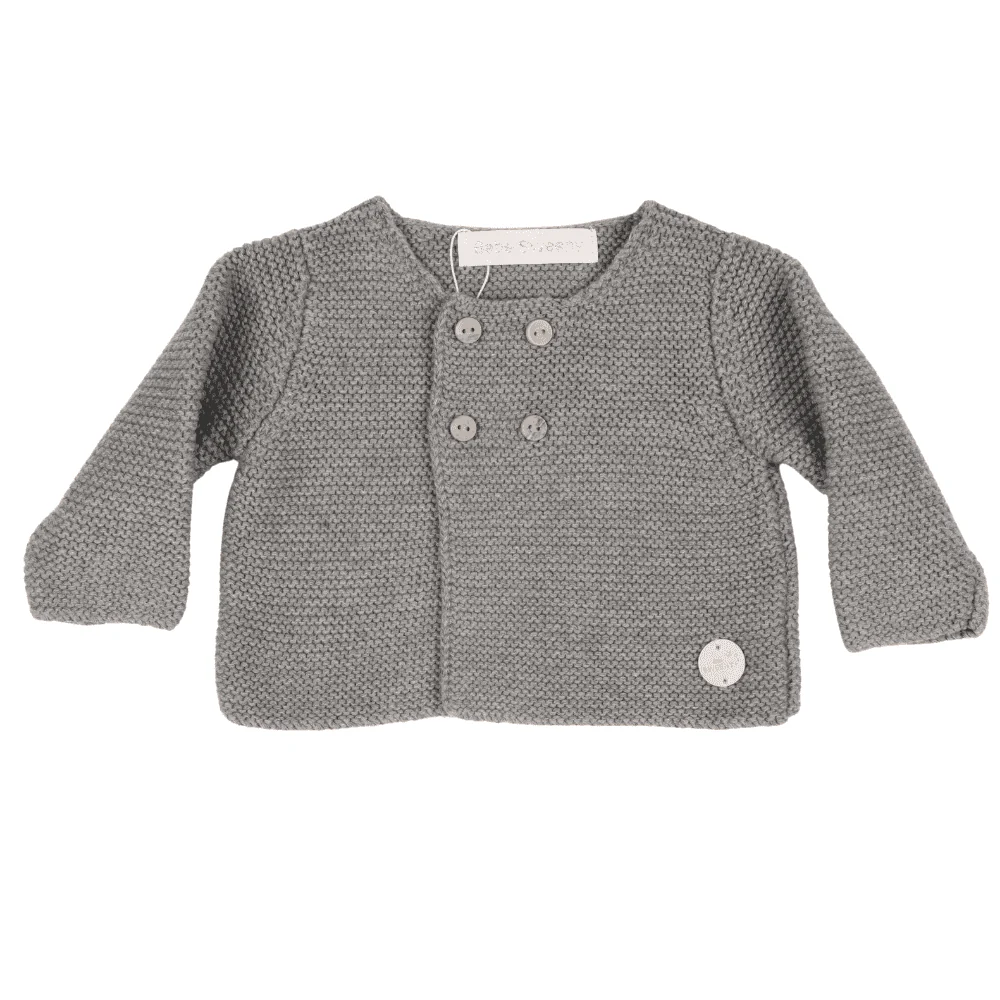 Grey knitted cardigan for baby boys in a cosy and comfortable shape. Suitable for all seasons. it is made in a soft cotton blend and fastens with wooden buttons on the front. The boxy cut creates a traditional look.