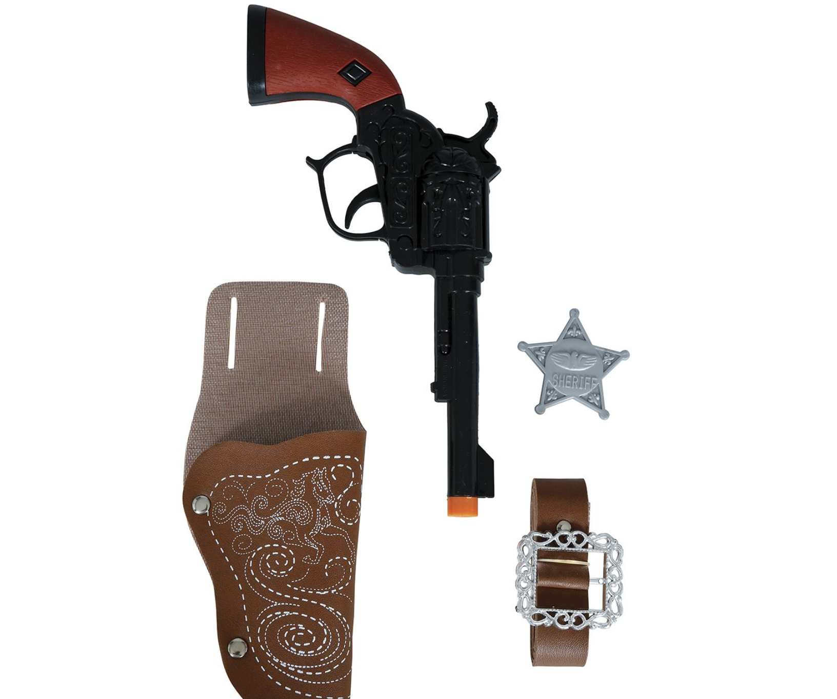 - Couleurs : Pistolet noir et marron, cartouchière marron, étoile de shérif argentée, boucle de ceinture marron et argentée.