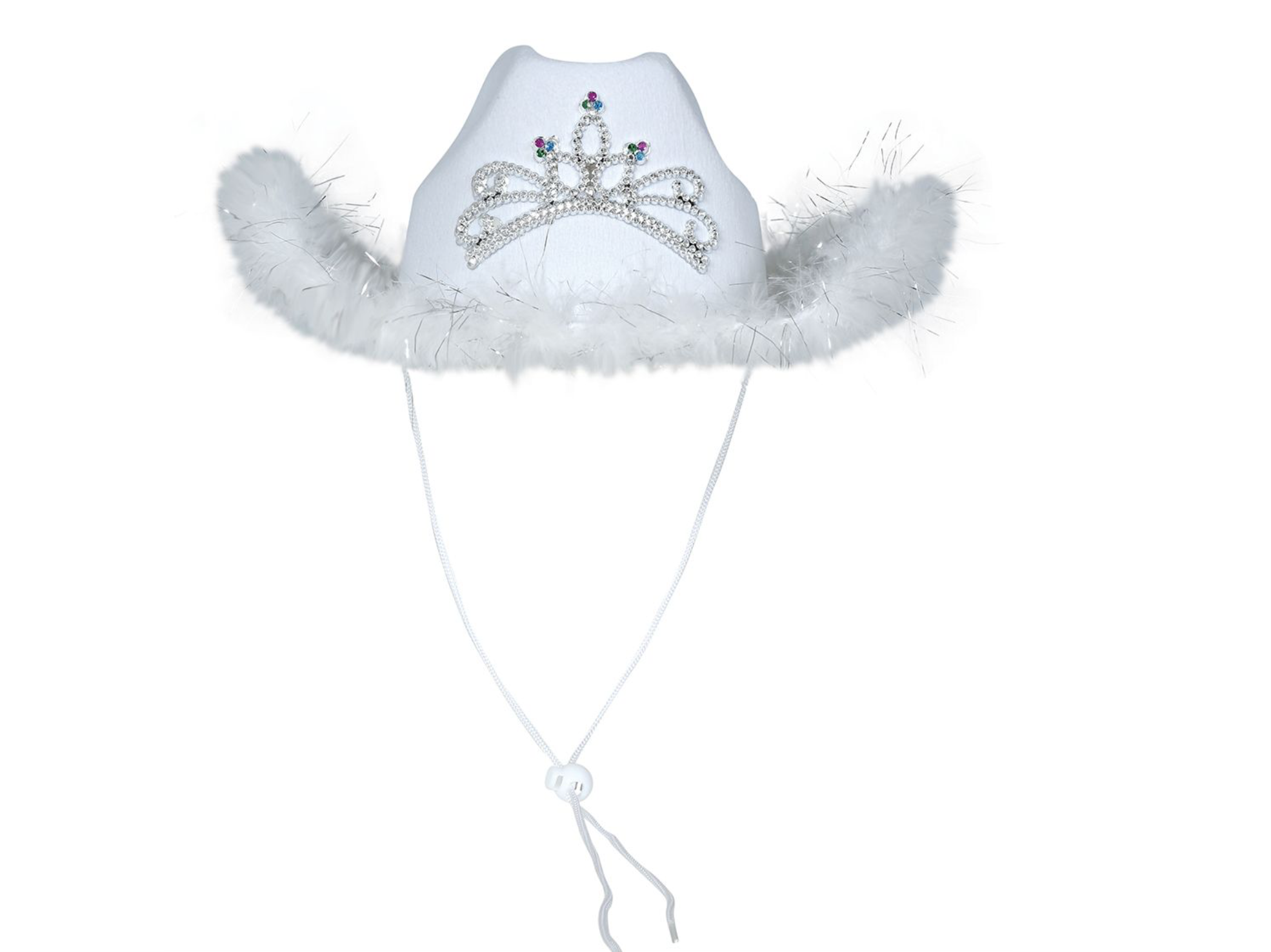 - Détails : Fausse couronne en strass, sequins, et boa blanc sur le bord.