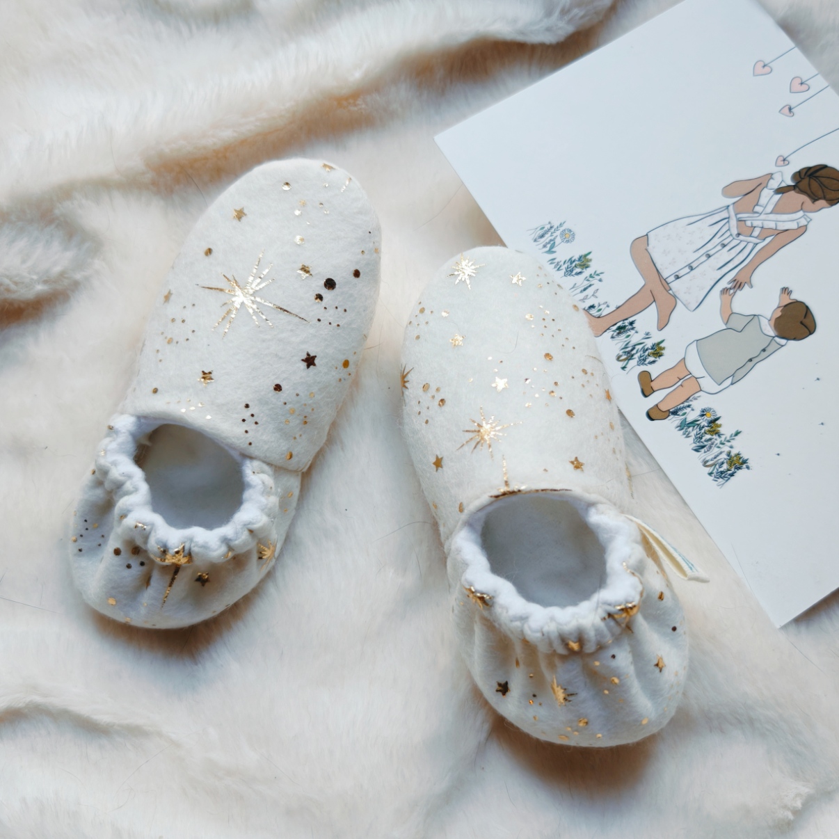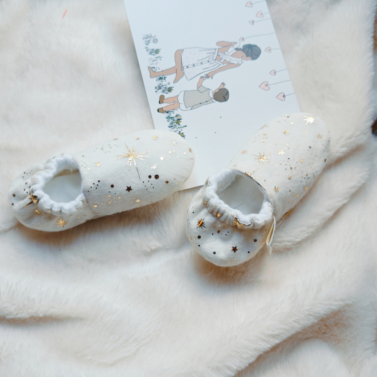 Chaussons naissance en coton blanc avec étoiles dorées : douceur et magie dès les premiers instants