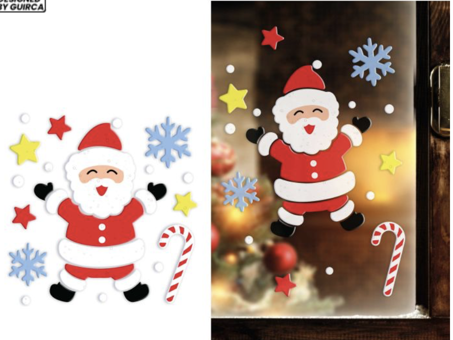 🎅 – Père Noël Festif ! 🎄 Apportez une touche d’enchantement à vos fenêtres avec cette décoration en gel à l’effigie du Père Noël. Amusante, colorée et facile à poser, elle transforme instantanément vos vitres en un tableau magique de Noël !