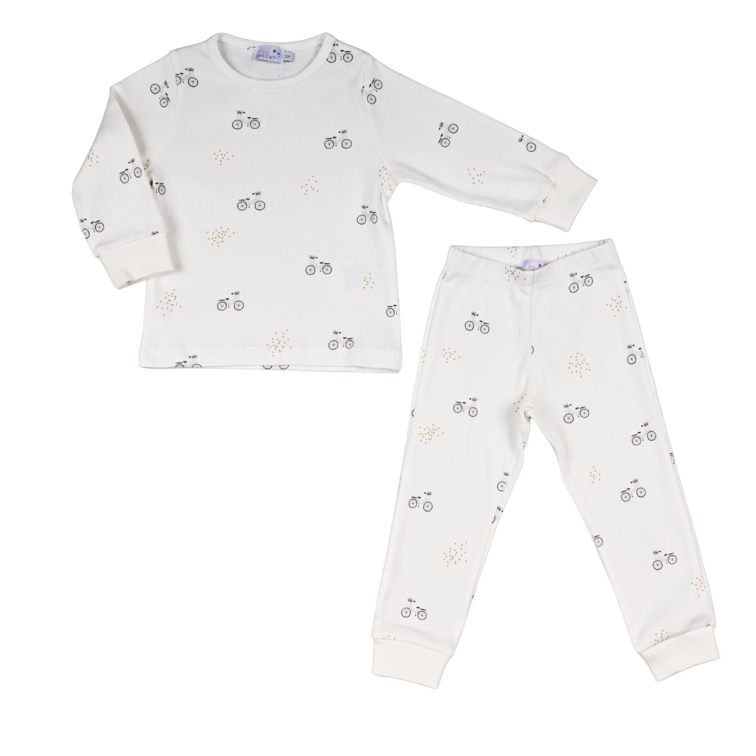 Ivory long two-piece set for boys, patterned in pretty grey and beige vintage bikes. Super soft and comfortable, this set is made in ribbed cotton jersey with ribbed trims. The trousers have a gently elasticated waist.