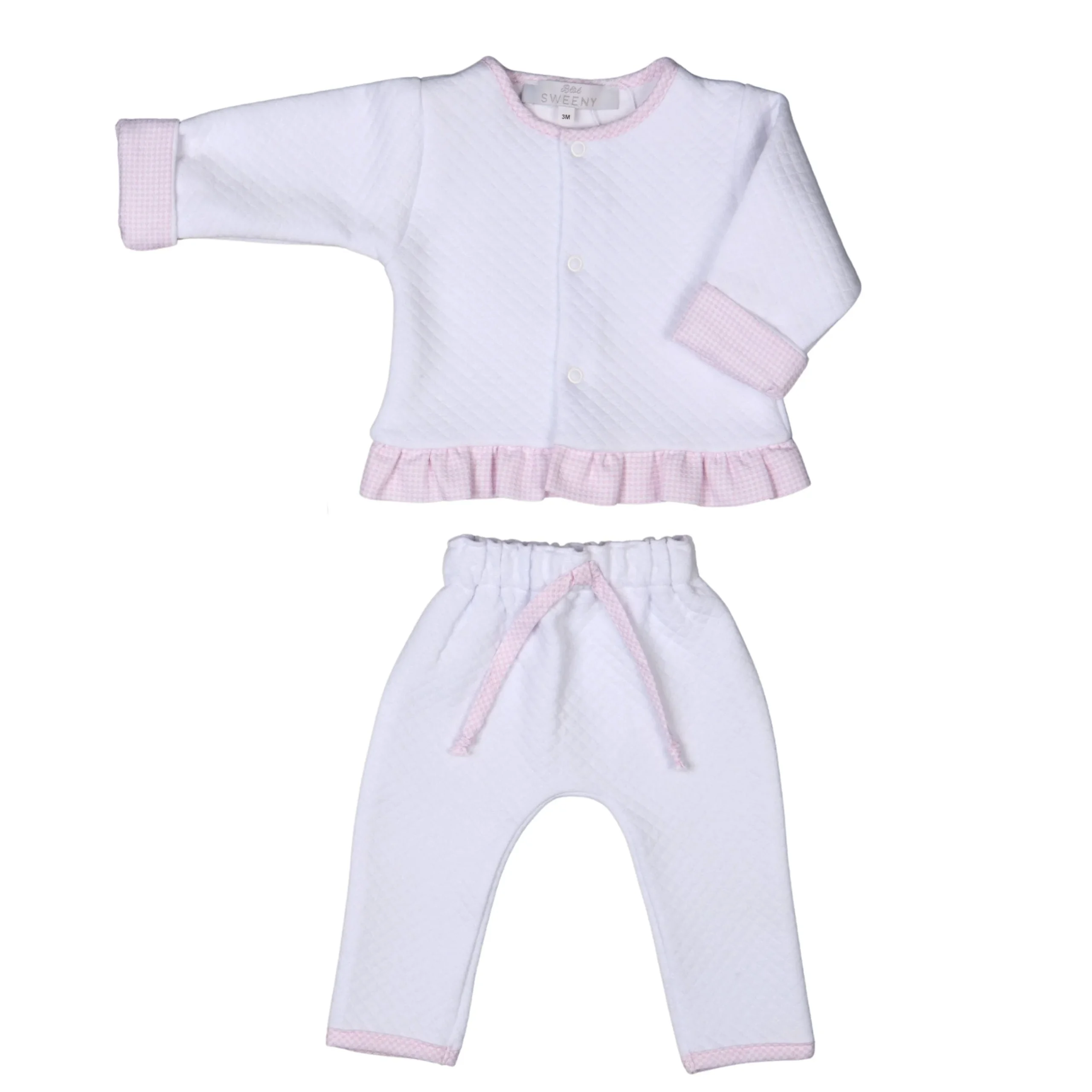 Adorable complete outfit baby girls. This set includes a white trousers set with the matching bodysuit. it’s made with a white quilted cotton and trimmed in our Lucy gingham cotton to add just the right touch of detail. The trousers offers comfort with an elasticated waistband. This elegant cotton set is easy to slip on and will offer comfort and ease to the little one from the very first day.