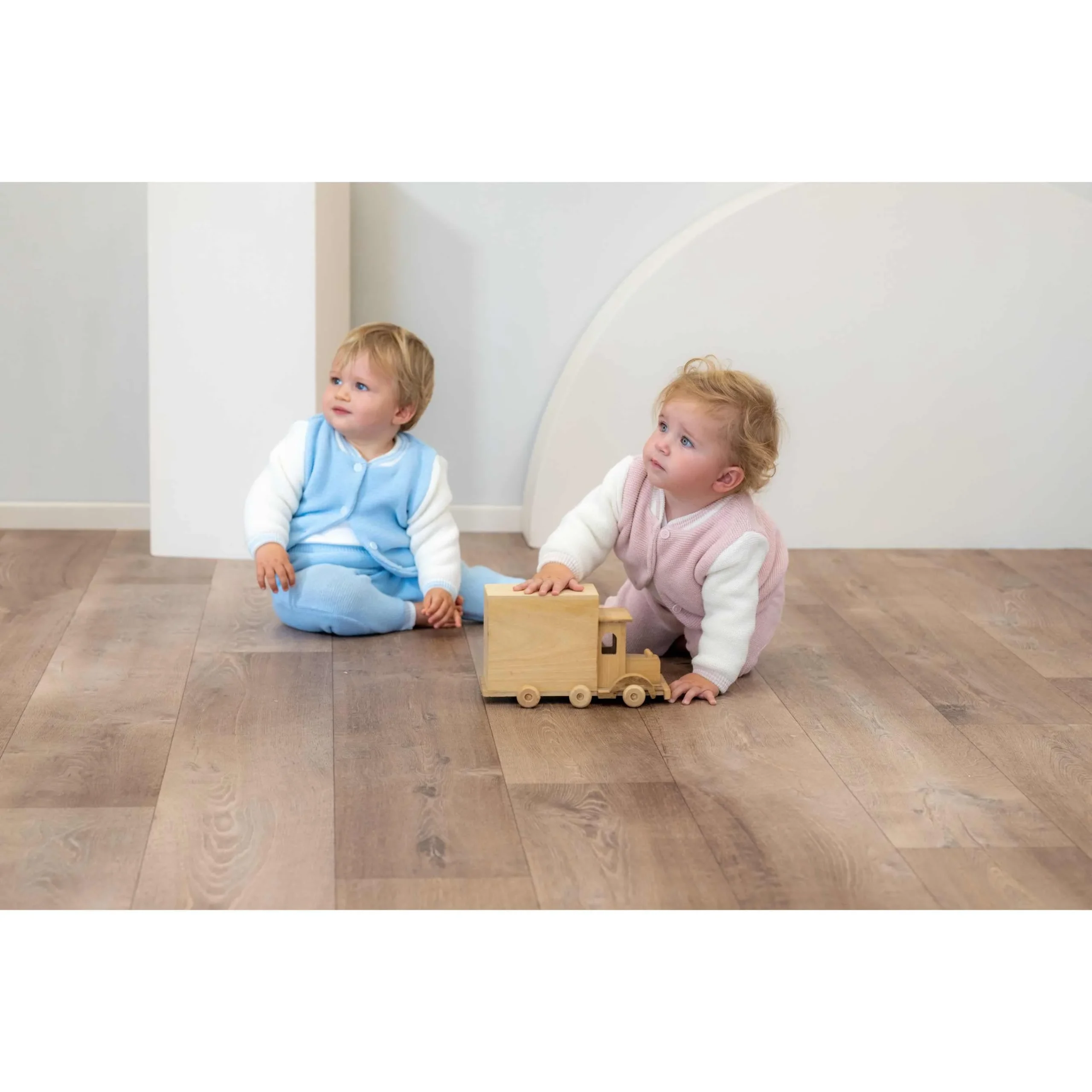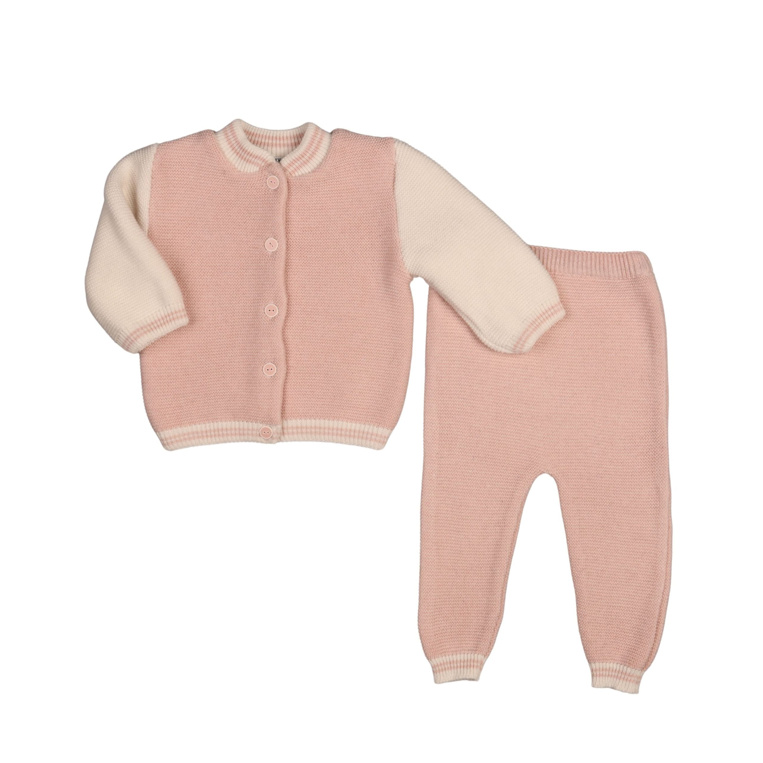 Powder pink and ivory trouser set for little girls knitted in a lovely garter stitch for a warm and cosy feel. Made in soft cotton blend, the set includes a pink bomber-style with ivory and pink striped ribbed trims and button fastenings. The matching trousers are elasticated on the waist for a comfortable fit and feel.