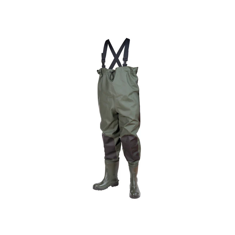 Fabriquée en polyester/P.V.C. et montée sur des bottes de sécurité, la Waders est équipée d’une semelle antiperforation, d’un embout de sécurité et de renforts noirs aux genoux. Grâce à ses bretelles élastiques ajustables dotées d’une boucle de fermeture, elle est également dotée d’une poche intérieure et peut être ajustée à la taille à l’aide d’un élastique et d’un cordon.